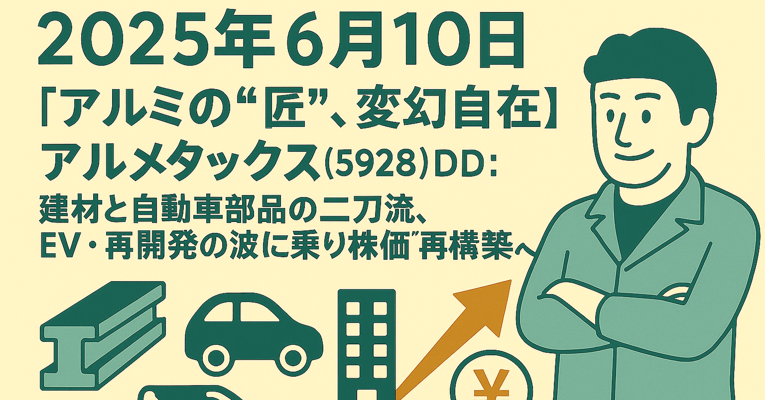 本日、私たちが徹底的にデュー・デリジェンス(DD)を行うのは、ビル用のアルミサッシ・カーテンウォールといった建材事業と、自動車向けの精密アルミ部品事業という、二刀流で独自のポジションを築く、**株式会社アルメタックス(証券コード:5928)**です。東証スタンダード市場に上場する同社は、70年以上にわたり、アルミ押出・加工技術を核として、日本の建設業と自動車産業という二大産業を支え続けてきました。