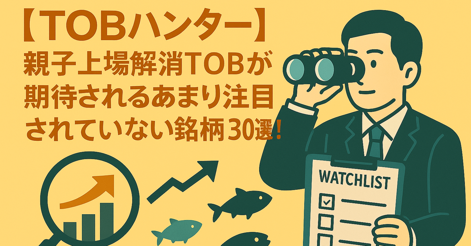 本日2025年6月11日(水曜日)の東京証券市場で注目される可能性のある銘柄をご紹介します。 コーポレートガバナンス改革が加速する中、企業価値向上や経営効率化の観点から「親子上場」の見直しが活発化しています。親会社による子会社の完全子会社化を目的としたTOB(株式公開買付)は、市場価格にプレミアムが上乗せされることが多く、投資家にとって大きなリターンを得る機会となります。 本稿では、まず「TOBされやすい企業の特徴」を解説し、その上でTOBが期待される可能性のある親子上場の「子会社」を中心に、関連銘柄も含めて30銘柄をリストアップいたします。
