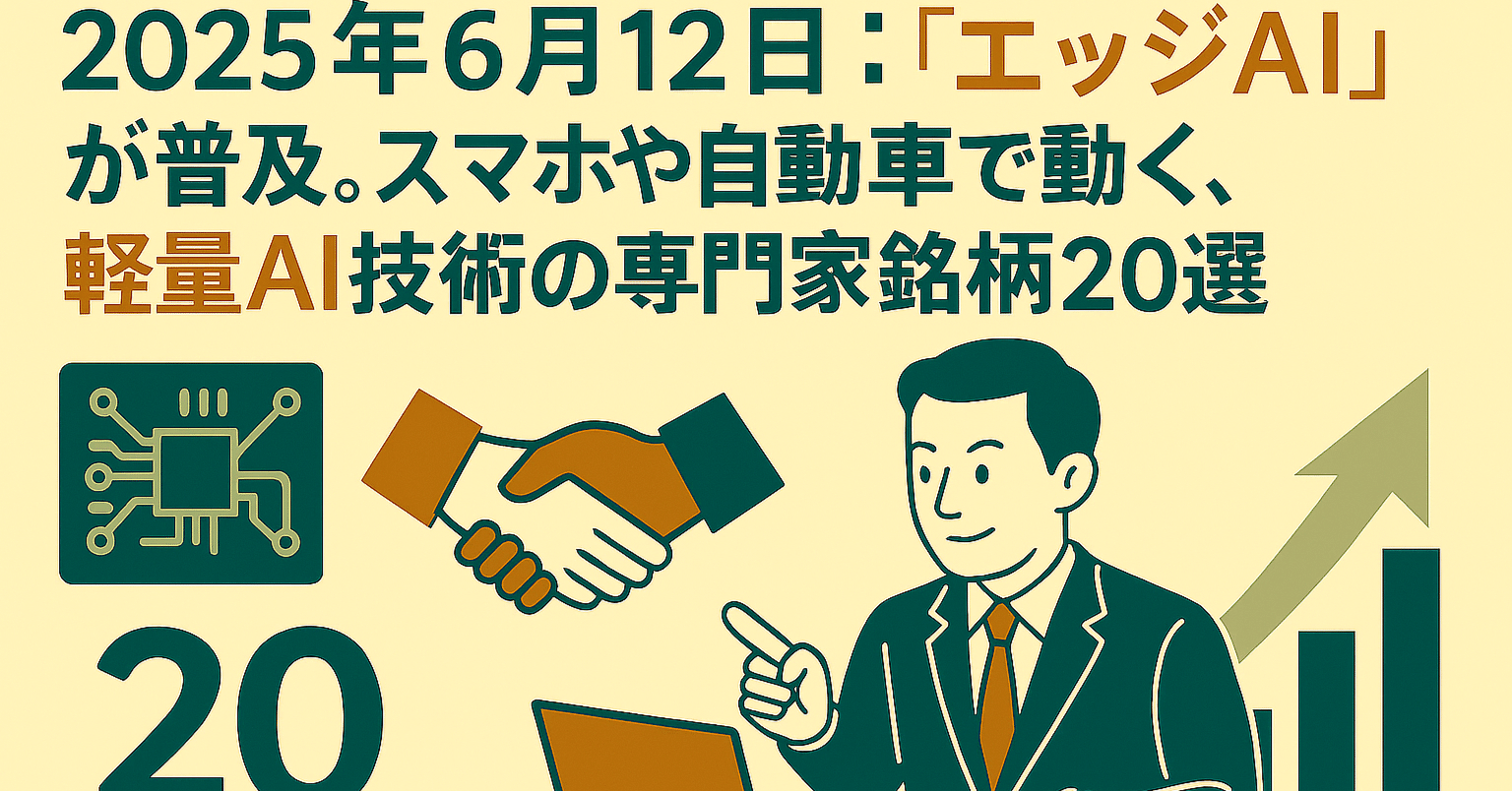 本日2025年6月12日(木曜日)の東京証券市場で注目される可能性のある銘柄をご紹介します。 AI技術の進化は、クラウド上の巨大なサーバーだけでなく、私たちの手元にあるスマートフォンや自動車、工場の機械といった「エッジ(末端)デバイス」で完結する「エッジAI」の時代を本格化させています。これにより、通信遅延のないリアルタイムな処理、プライバシーの保護、そしてインターネット接続がない環境でのAI活用が可能になります。 本日は、この「エッジAI」の普及を支える、スマートフォンや自動車で動く軽量AI技術に強みを持つ専門家企業を20社、分野別にご紹介いたします。