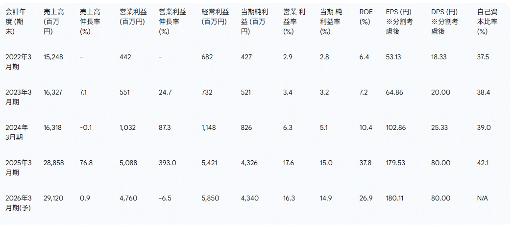 注: EPSおよびDPSは2024年10月1日付の1:3の株式分割を遡及修正して調整。2022年3月期以前のROE、EPS、DPSは分割調整後の概算値。2026年3月期のROEは予想純利益と期首・期末純資産平均(期末純資産は未公表のため期首純資産で代用)に基づき算出。数値は主に 及び有価証券報告書 より作成。過去の詳細なROEや株主資本比率等は有価証券報告書の参照が必要。
