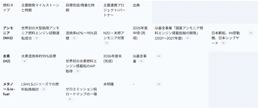 J-ENGの将来戦略の中核を成すのは、海事産業における喫緊の課題であるGHG(温室効果ガス)排出量削減目標達成に向けた、次世代燃料エンジンの開発である。アンモニア、水素、メタノールといったカーボンニュートラルまたは低炭素燃料に対応するエンジンの実用化は、同社の持続的成長と市場におけるリーダーシップ維持に不可欠である 。