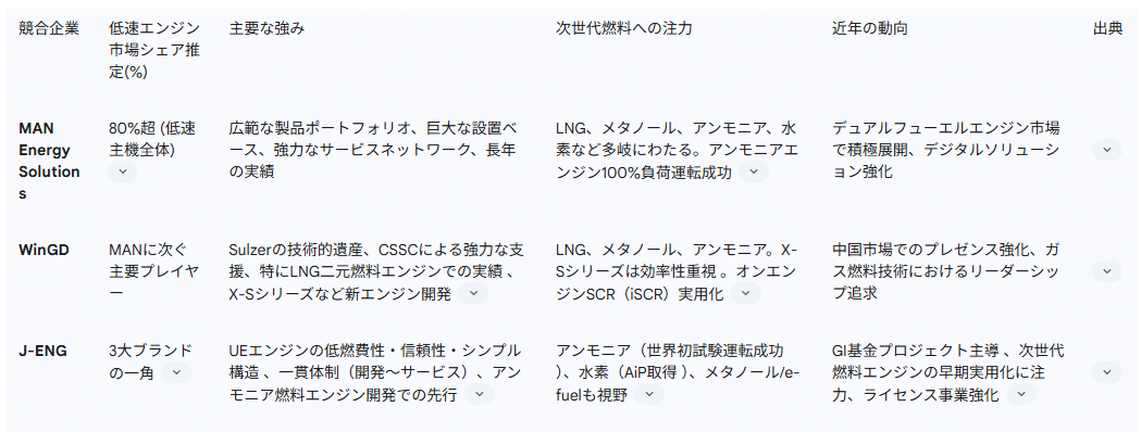 この表は、低速舶用エンジン市場の主要プレイヤーを比較したものである。J-ENGのポジションを文脈化し、競争ダイナミクスを理解し、各社が脱炭素化という重要な課題にどのように取り組んでいるかを示している。投資家は、競合他社が誰であり、同社がどのように対抗しているかを理解する必要がある。この表は、主要企業の重要な属性と戦略的方向性を構造化された方法で比較するのに役立つ。