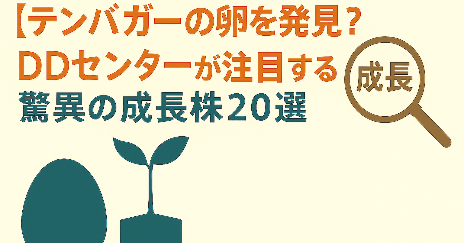 2025年6月17日(火曜日)の東京証券市場で注目される可能性のある銘柄をご紹介します。 すべての投資家が夢見る、株価が10倍になる「テンバガー」。その多くは、まだ市場にその真価が広く認識されていない「卵」の状態で眠っています。これらの企業は、革新的な技術やビジネスモデルで、未来の産業構造を塗り替えるほどのポテンシャルを秘めています。 本日は、当DD(デューデリジェンス)センターが、そのような「テンバガーの卵」となる可能性を秘めた、驚異の成長株を20銘柄、分野別に厳選してご紹介いたします。