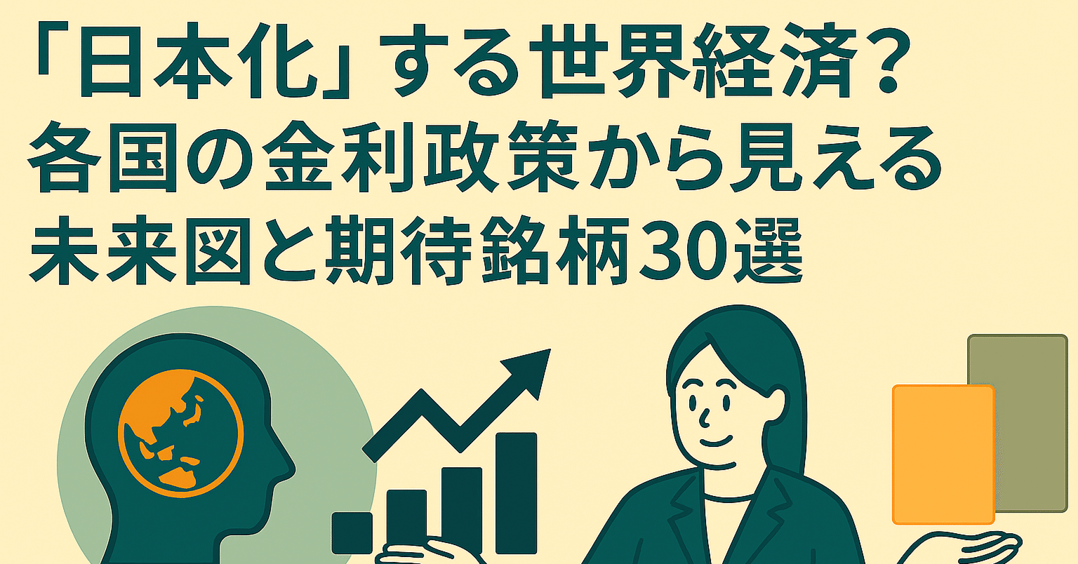 2025年6月20日(金曜日)の東京証券市場で注目される可能性のあるテーマと銘柄をご紹介します。 世界各国がインフレ抑制のために利上げを進めてきましたが、その反動として景気減速への懸念が高まっています。かつて日本が経験した「低成長・低インフレ・低金利」が続く「日本化(Japanification)」が、今、世界経済の新たなキーワードとして浮上しています。各国の中央銀行が利下げに転じても、その後の利上げが難しい状況になれば、世界は新たな局面を迎えます。 本稿では、この**「日本化」する世界経済という大きな潮流の中で、どのような企業が強さを発揮するのかを解説し、関連する注目銘柄を30社**ご紹介いたします。