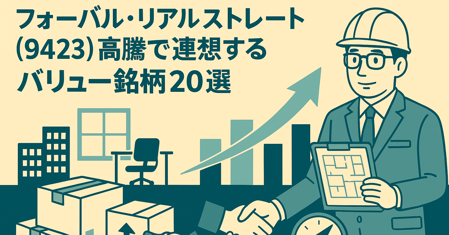 2025年6月25日(水曜日)の東京証券市場で注目される可能性のある銘柄をご紹介します。 昨日来、中小企業向けオフィス移転コンサルティングなどを手掛けるフォーバル・リアルストレート(9423 東証スタンダード)の株価が市場の大きな注目を集め、高騰しています。この動きは、働き方の多様化や都心部の再開発を背景に、企業のオフィス移転・リニューアル需要が本格化していることへの再評価が始まったサインと捉えることができます。 本日は、この流れを受け、同様に「オフィス関連需要」の恩恵を受けると期待されながらも、株価がまだ割安な水準にある関連のバリュー銘柄を20社、分野別に厳選してご紹介いたします。