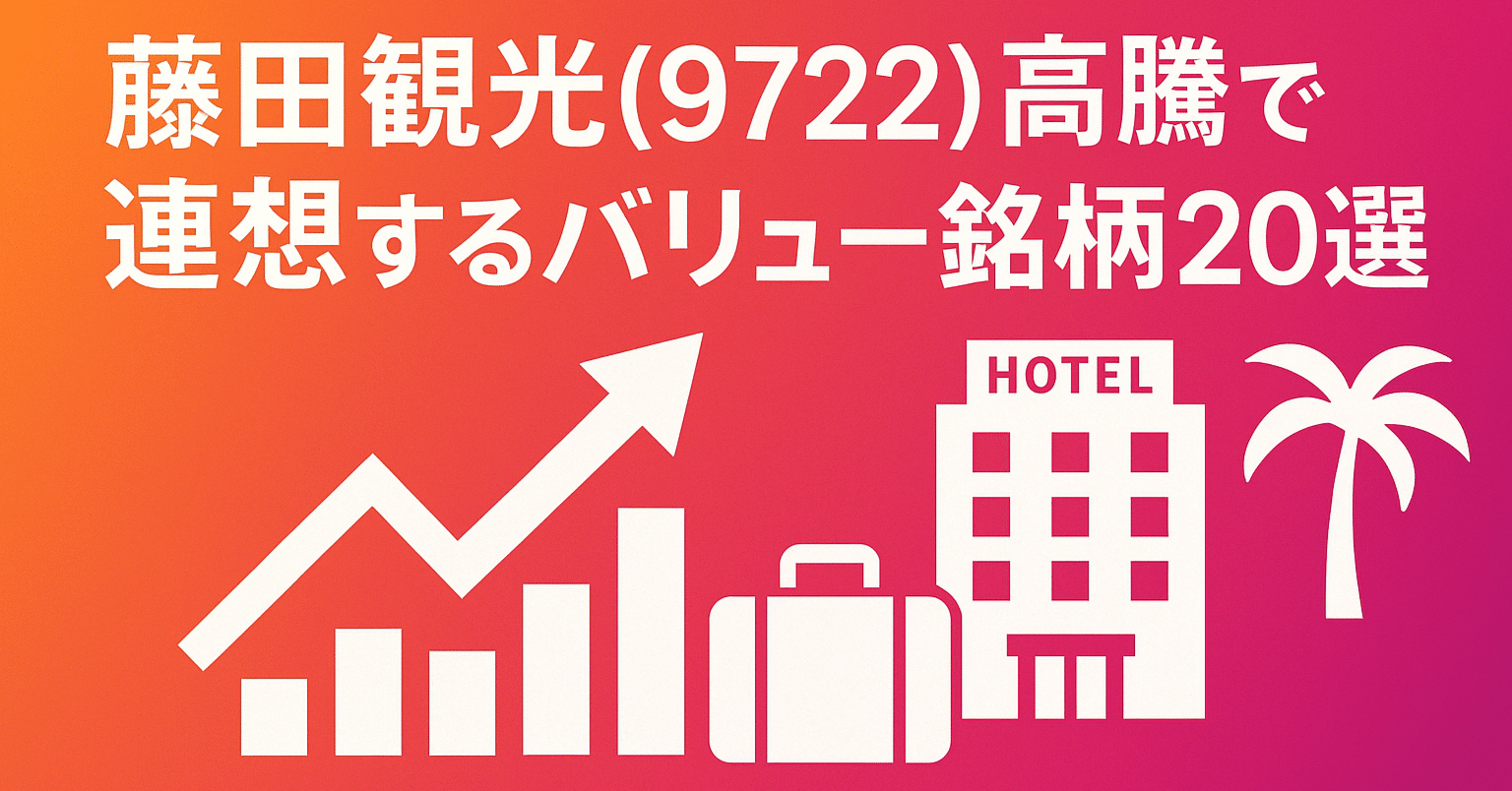2025年6月27日(金曜日)の東京証券市場で注目される可能性のある銘柄をご紹介します。 昨日来、「ホテル椿山荘東京」や「ワシントンホテル」などを運営する名門、藤田観光(9722 東証プライム)の株価が市場の大きな注目を集め、高騰しています。この動きは、過去最高を更新し続けるインバウンド(訪日外国人)需要と、それに伴うホテル稼働率・客室単価の向上を背景に、観光・サービスセクターの「資産価値」と「収益力」への再評価が本格的に始まったサインと捉えることができます。 本日は、この流れを受け、藤田観光と同様にインバウンド回復の恩恵を受けながらも、株価がまだ割安な水準にある関連のバリュー銘柄に連想買いが向かう可能性を考え、注目すべき20社を分野別に厳選してご紹介いたします。