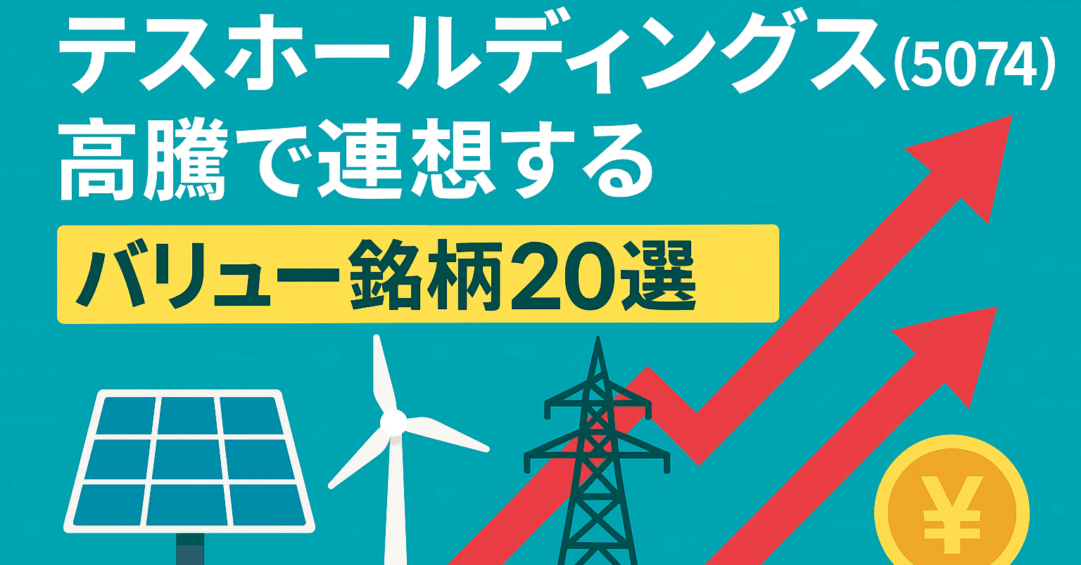 2025年7月10日(木曜日)の東京証券市場で注目される可能性のある銘柄をご紹介します。 昨日来、再生可能エネルギーの発電事業などを手掛けるテスホールディングス(5074 東証プライム)の株価が、市場の大きな注目を集め高騰しています。この動きは、エネルギー安全保障や脱炭素社会の実現に向けたGX(グリーン・トランスフォーメーション)への関心が、株式市場の大きなテーマとして再燃したことを示しています。 本日は、この流れを受け、テスホールディングスと同様に「再生可能エネルギー」「GX」といったテーマで恩恵を受けると期待されながらも、株価がまだ割安な水準にある関連のバリュー銘柄に連想買いが向かう可能性を考え、注目すべき20社を分野別に厳選してご紹介いたします。