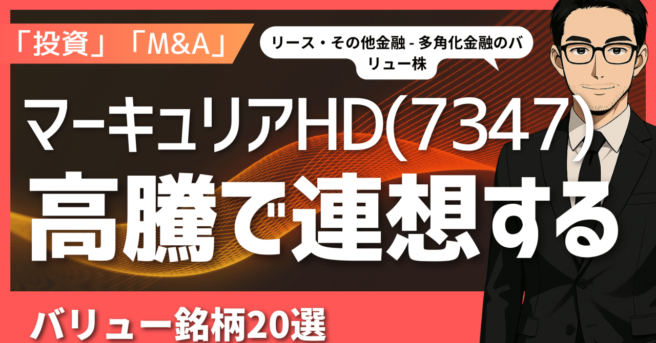 2025年7月14日(月曜日)の東京証券市場で注目される可能性のある銘柄をご紹介します。 先週末来、プライベートエクイティや不動産など、オルタナティブ(代替)投資分野のファンド運営を手掛けるマーキュリアホールディングス(7347 東証プライム)の株価が、市場の大きな注目を集め高騰しています。この動きは、伝統的な株式や債券以外への投資や、M&Aを通じた企業価値向上への関心が高まっていることの表れと考えられます。 本日は、この流れを受け、マーキュリアHDと同様に「投資」「M&A」「金融サービス」といったテーマで独自の強みを持つ、関連のバリュー銘柄に連想買いが向かう可能性を考え、注目すべき20社を分野別に厳選してご紹介いたします。
