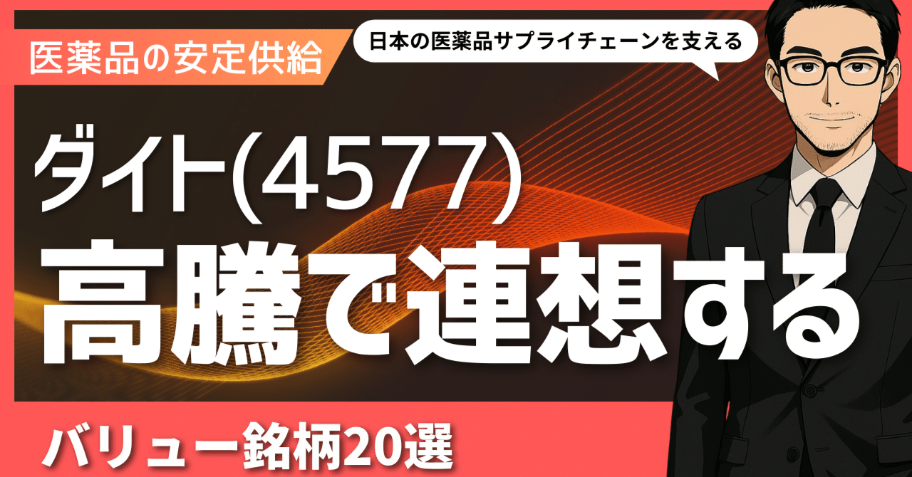 ◎「ダイト」高騰との関連性と注目理由: ダイトのようなメーカーが製造した医薬品を、全国の医療機関や薬局に安定供給する、社会インフラそのもの。PBRも割安で、ディフェンシブなバリュー株の代表格です。
