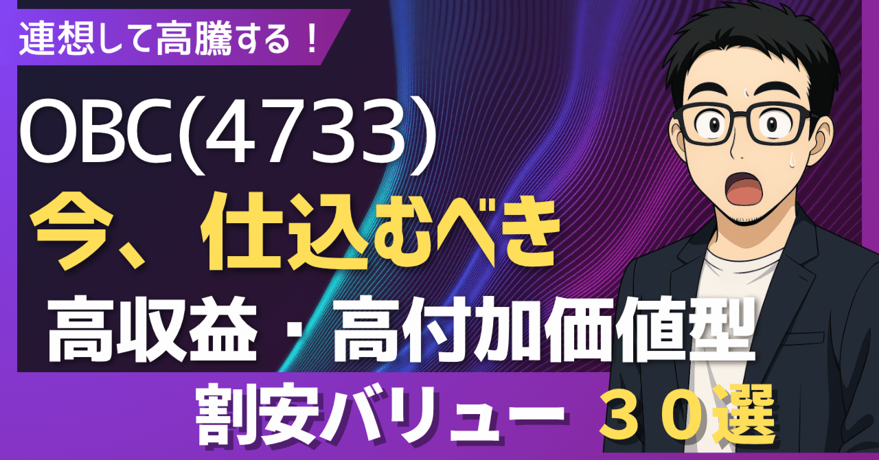 この記事では、OBCの成功の要因を分解し、そこから連想される「次なる主役候補」をバリュー株という切り口で30銘柄、厳選してご紹介します。選定のテーマは以下の通りです。