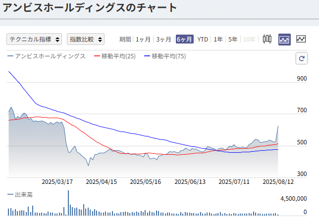 アンビスホールディングス (7071) 今日の株価、予想(AI株価診断など)、チャート推移、ニュース、その他にも今後の見通