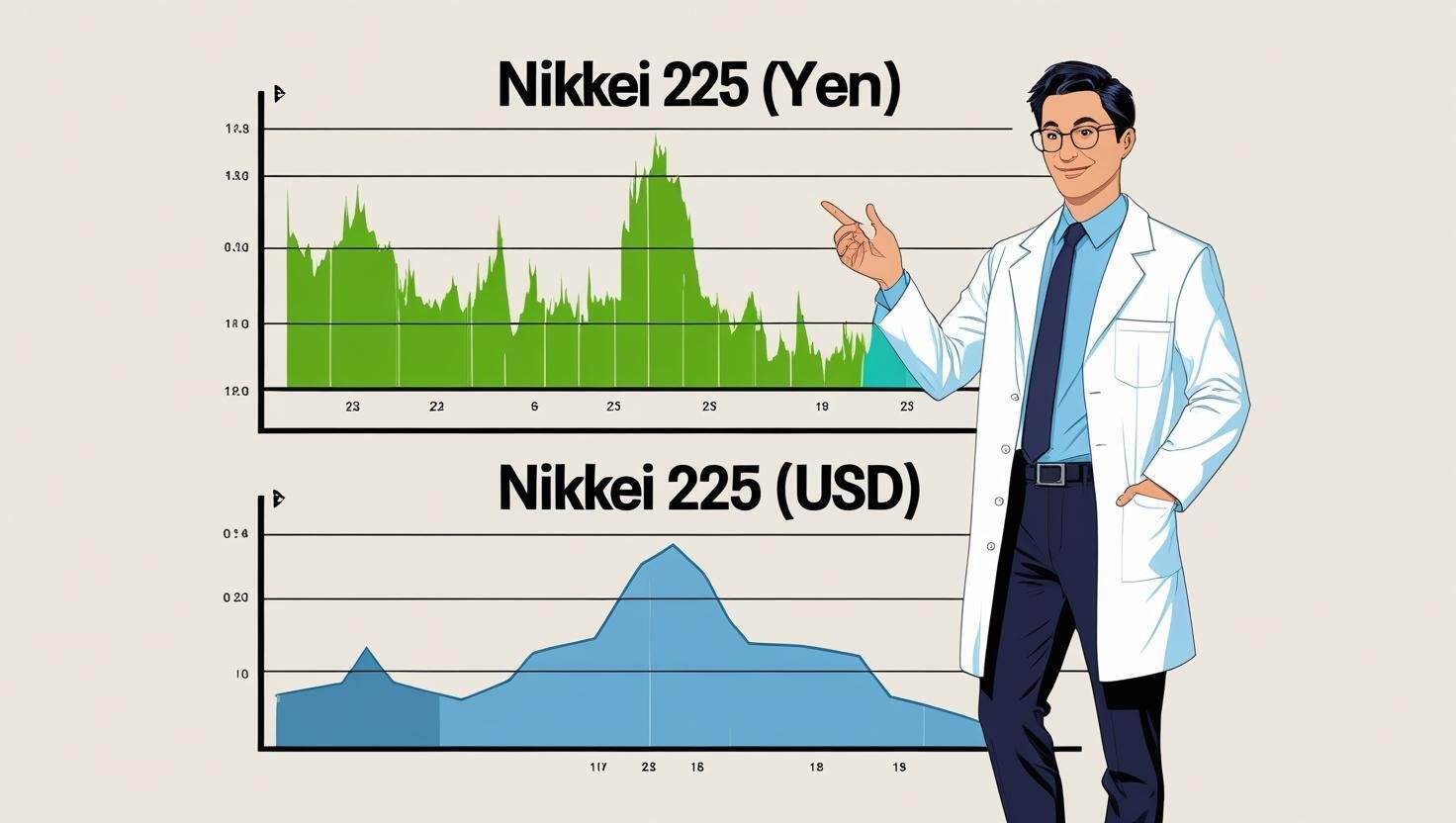 例えば、日経平均が40,000円で、1ドル150円であれば、ドル建て日経平均は「266.6ドル」となります。もし円高が進み1ドル130円になれば、同じ40,000円でも「307.7ドル」に上昇します。逆に、円安が進み1ドル160円になれば、「250ドル」に下落します。