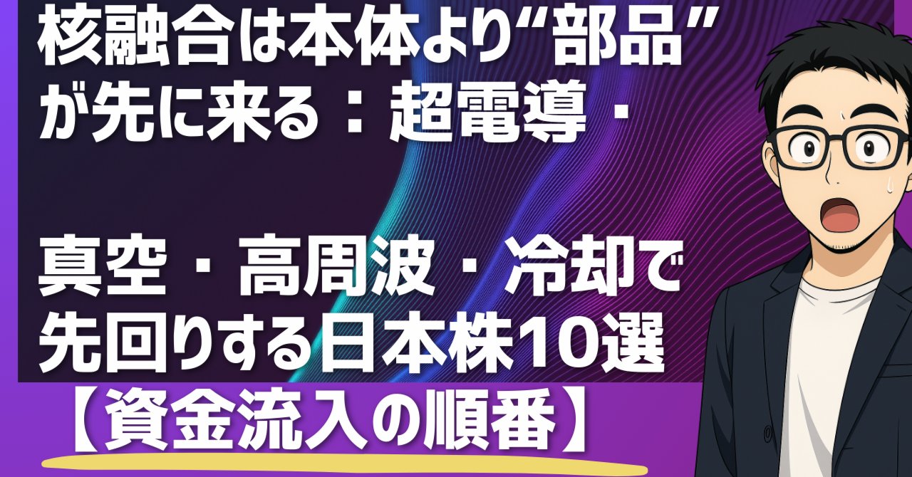 本記事では、この「超電導」「真空」「高周波」「冷却」という、核融合の成否を握る4つの核心技術に焦点を当て、世界をリードする日本の隠れた実力派企業を10銘柄厳選してご紹介します。これらの企業は、核融合という巨大なテーマの恩恵を真っ先に受ける可能性を秘めています。未来のエネルギー革命を先取りし、大きな成長の波に乗るための羅針盤として、ぜひ本記事をご活用ください。