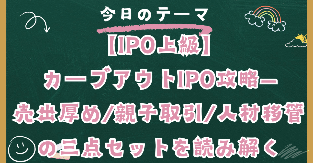 【IPO上級】カーブアウトIPO攻略—売出厚め/親子取引/人材移管の三点セットを読み解く 2026 3/30 IPO(新規公開株式)ロードマップ — 入門から上級まで 2025年9月20日2026年3月30日 IPO(新規公開株式)ロードマップ — 入門から上級まで よかったらシェアしてね! URLをコピーしました! URLをコピーしました! 【IPO上級】赤字成長SaaSの勝ち筋—ユニット経済×SO/RSU×ロックアップで“初値後”を設計 【IPO上級】メガIPOの需給戦略—巨大吸収額・配分偏り・指数影響の扱い方 この記事を書いた人 日本個別株デューデリジェンスセンター 関連記事 IPO(新規公開株式)ロードマップ:なぜ、あのIPOは「初値高騰」したのか? 目論見書の正しい読み方 2025年11月9日 【緊急IPO分析】SBI新生銀行「買い」の前に読むべきDDレポート:時価総額1兆円の”死角”と、SBI経済圏が抱えるリスク 2025年10月30日 SBI新生銀行IPO「時価総額1兆円」は妥当か? DDのプロが徹底解剖する「第4のメガバンク」の企業価値と”買い”の判断ライン 2025年10月30日 【IPO上級】連続上場期を制す—同日/連日上場の資金配分と見送り基準 2025年9月20日 【IPO上級】メガIPOの需給戦略—巨大吸収額・配分偏り・指数影響の扱い方 2025年9月20日 【IPO上級】赤字成長SaaSの勝ち筋—ユニット経済×SO/RSU×ロックアップで“初値後”を設計 2025年9月20日 【IPO中級】親子上場/再上場のクセ—取引関係とガバナンスが評価に与える影響 2025年9月20日 【IPO中級】希薄化と売り圧の読み方—SO・第三者割当・VC比率が初値後に与える影響 2025年9月20日 コメント コメントする コメントをキャンセルコメント ※ 名前 ※ メール ※ サイト 次回のコメントで使用するためブラウザーに自分の名前、メールアドレス、サイトを保存する。