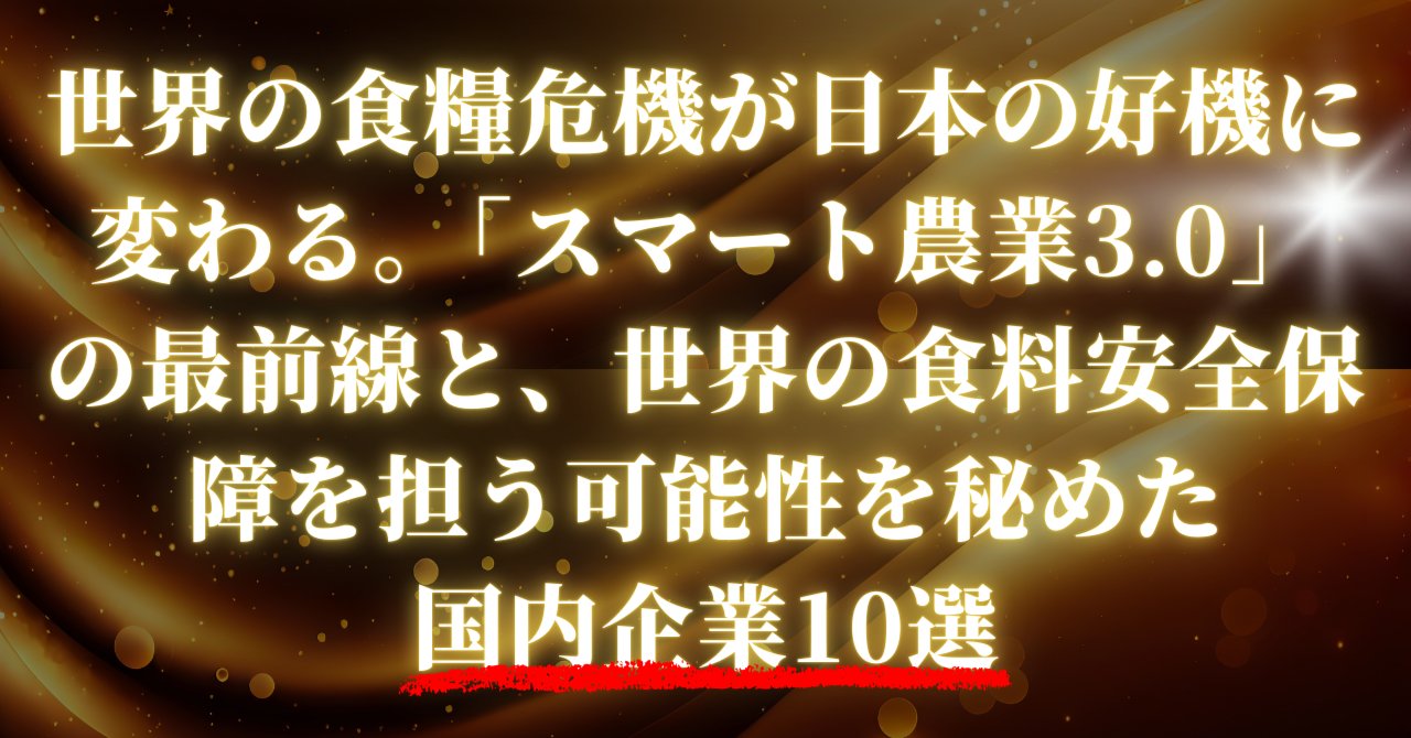 この技術革新は、国内の食料自給率を劇的に向上させるだけでなく、高品質で安全な日本の農産物を世界に安定供給する道を拓きます。さらに、日本が培ったスマート農業の技術やシステムそのものをパッケージとして輸出すれば、世界の食料安全保障に大きく貢献し、新たな巨大産業を創出することも夢ではありません。食糧危機という暗雲が世界を覆う今だからこそ、日本の技術力が光を放ちます。本記事では、この「スマート農業3.0」の最前線を走り、未来の食料安全保障を担う可能性を秘めた国内企業を厳選してご紹介します。彼らの挑戦の中に、日本の新たな成長戦略と、投資家にとっての大きなチャンスが隠されているはずです。
