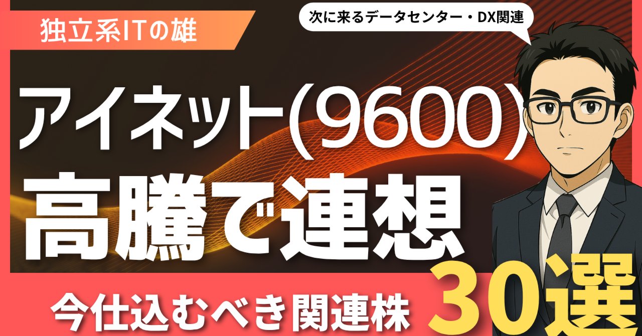 この記事では、アイネットの株価高騰をきっかけとして、今改めて注目すべき関連銘柄を30社、厳選してご紹介します。「データセンター・クラウド」「DX支援」「AI・セキュリティ」「独立系SIer」といった複数の切り口から、それぞれにキラリと光る個性を持つ企業をピックアップしました。誰もが知る巨大企業だけでなく、これから大きな成長が期待される中堅企業も積極的に取り上げています。