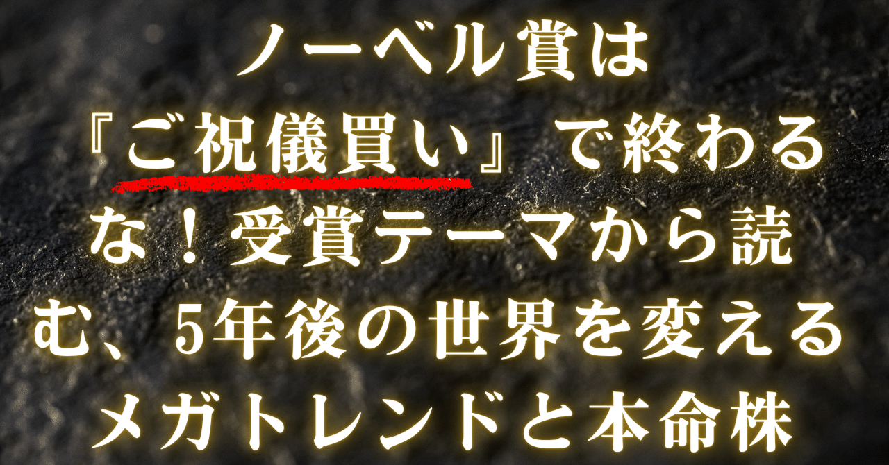 2025年10月、今年もまた、人類の知の地平を押し広げた偉大な功績を称えるノーベル賞が発表されました。市場は即座に反応し、関連銘柄とされる企業の株価は一時的に急騰。しかし、経験豊富な投資家の皆様はすでにご存知のはずです。この熱狂は、多くの場合、長続きしません。本稿の目的は、この短期的な「ご祝儀買い」の波に乗り遅れたことを嘆くことではなく、そのさらに先を見据えることにあります。