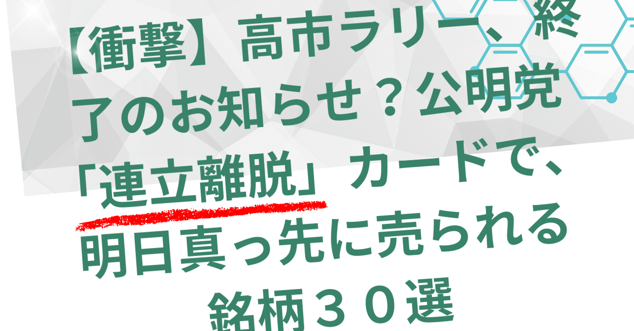 【衝撃】高市ラリー、終了のお知らせ?公明党「連立離脱」カードで、明日真っ先に売られる銘柄30選