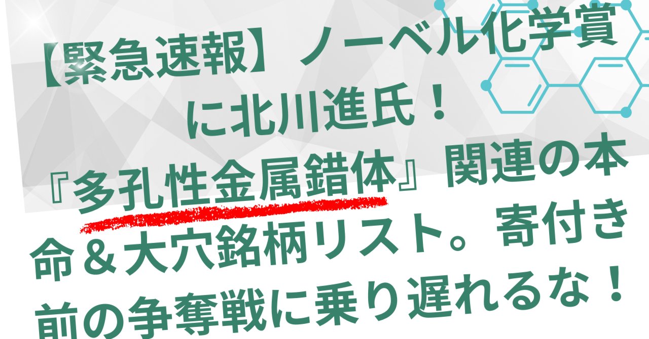 ノーベル化学賞関連「多孔性金属錯体(PCP/MOF)」注目銘柄