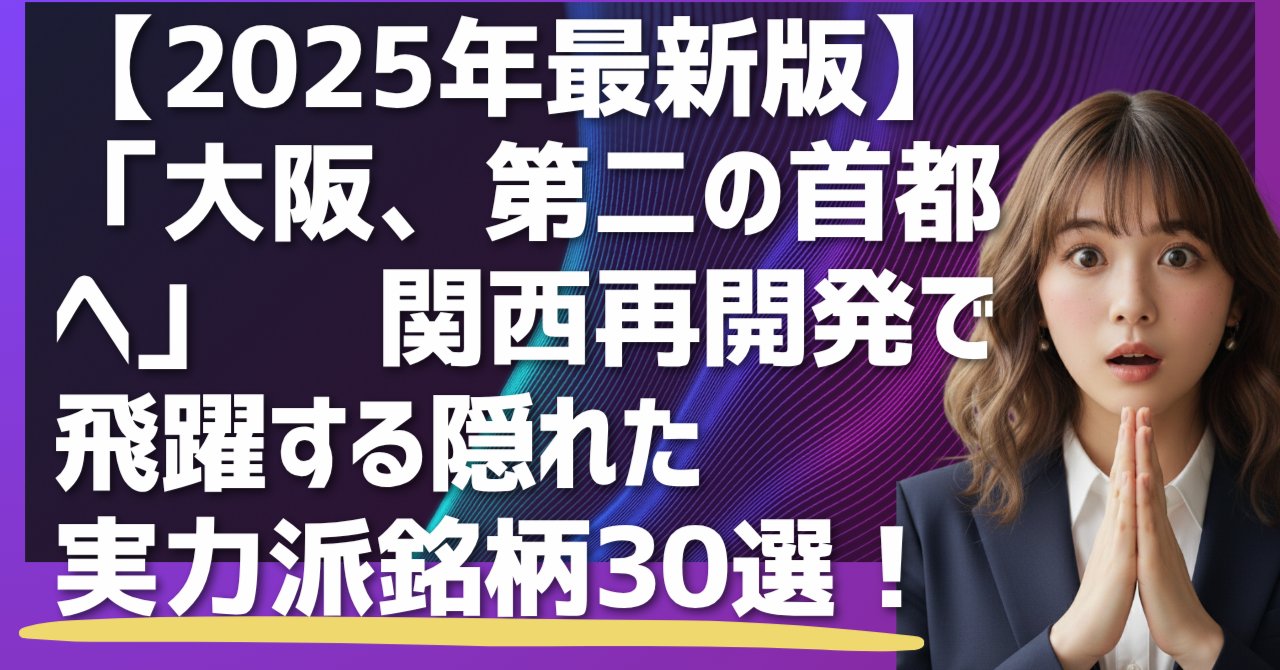 本記事では、「大阪=第二の首都」という壮大なテーマを深掘りし、再開発の最前線で活躍する不動産・建設セクターを主軸に、インフラ、万博・IR、インバウンド消費といった多角的な視点から、今後大きな成長が期待される銘柄を30社厳選しました。単なる有名企業リストではありません。大阪に強固な地盤を持ち、専門性の高い技術や独自のビジネスモデルで輝きを放つ、未来の主役候補たちです。各銘柄の事業内容から、なぜ今注目すべきなのかという具体的な理由、そして潜在的なリスクまで、詳細な分析と共にお届けします。この記事が、あなたのポートフォリオに新たな輝きをもたらす一助となれば幸いです。未来の大阪を共に創り上げる企業への投資を通じて、日本の次なる成長ストーリーに参加してみませんか。