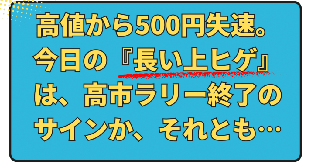 高値から500円失速。今日の『長い上ヒゲ』は、高市ラリー終了のサインか、それとも…