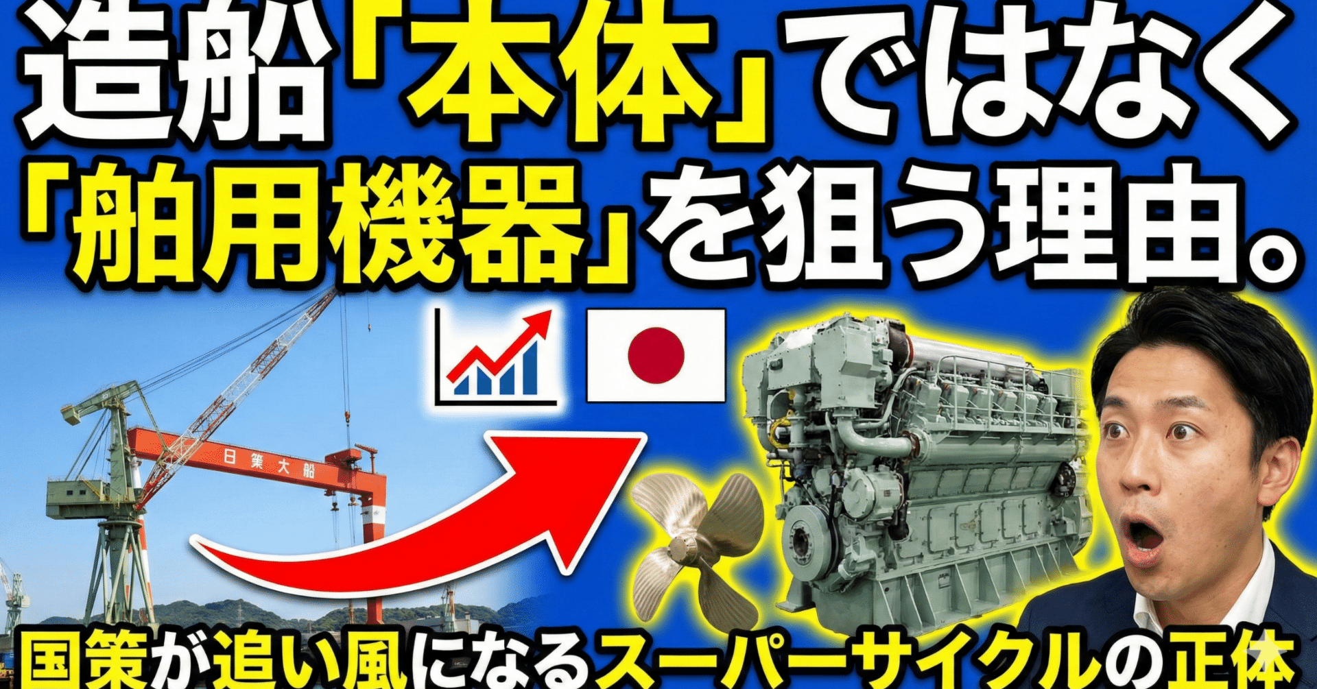 実は今、プロの視線は造船所の「本体」から、少しずれた場所に注がれています。 それが、今回のテーマである「舶用機器(サブ銘柄)」です。