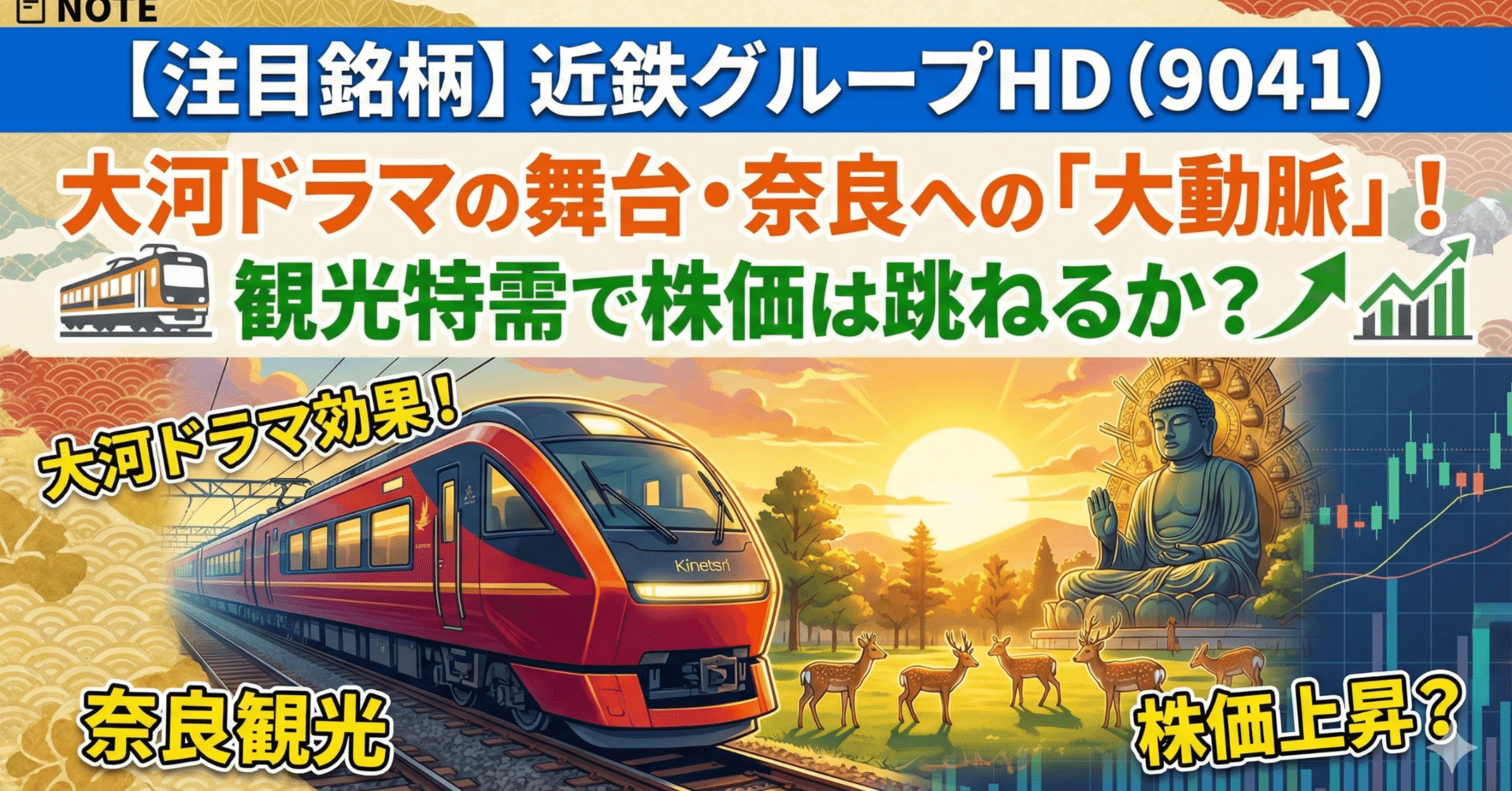 短期的にはインバウンド関連としての人気化、中期的には万博・大河ドラマという実需の発生が見込まれます。 特に、**「まだ株価に完全には織り込まれていない奈良エリアの観光爆発」**というシナリオにかけるのであれば、近鉄GHDはポートフォリオの中核(ディフェンシブかつ成長期待枠)として非常に魅力的な選択肢と言えます。