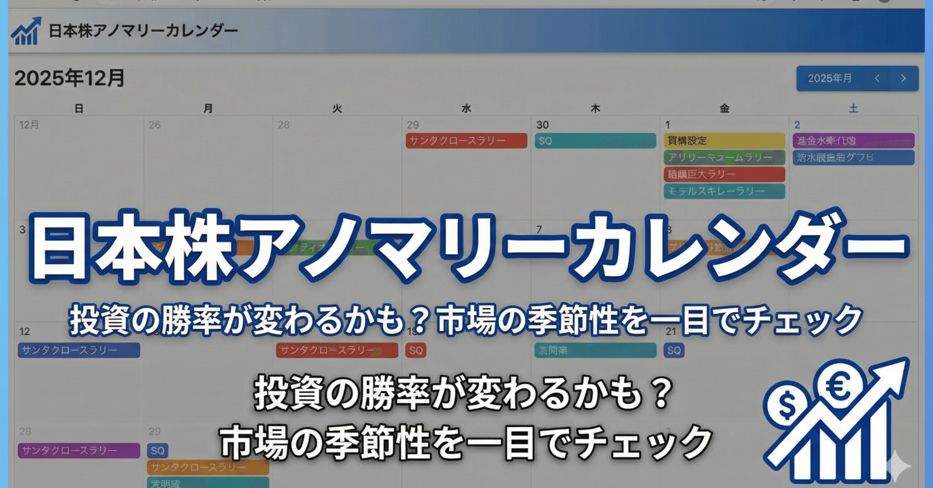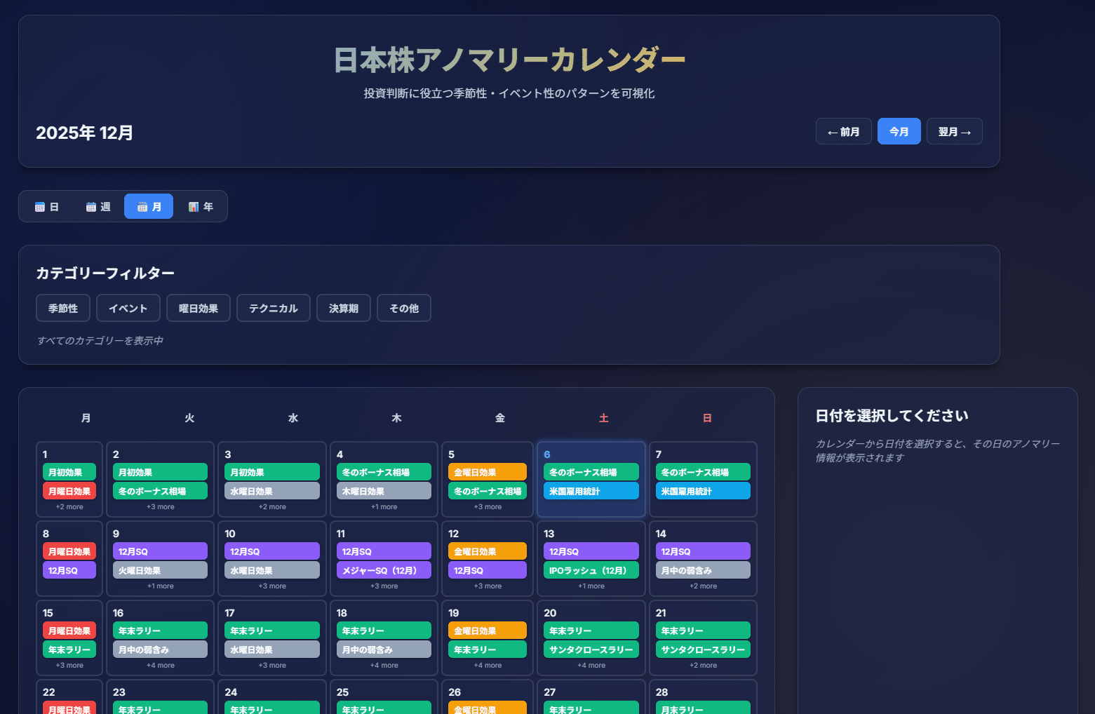 カレンダー表示: 月ごとに、その日に発生しやすいアノマリー(例:月曜日効果、SQ、IPOラッシュなど)が表示されます。