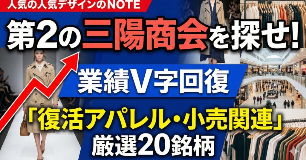 かつて「斜陽産業」と揶揄されたアパレル・小売業界に、今、強烈な追い風が吹いています。その象徴とも言えるのが**三陽商会(8011)**です。バーバリーのライセンス契約終了後、長らく赤字に苦しんでいましたが、「脱・百貨店依存」「不採算店舗の大量閉... -