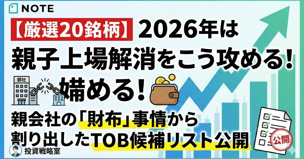 投資に関する免責事項 本記事は情報の提供のみを目的としており、特定の有価証券の売買、勧誘を目的としたものではありません。掲載されている情報は、作成時点(2026年1月3日)における信頼できると思われる情報源に基づき作成していますが、その正確性、完全性を保証するものではありません。特にTOB(株式公開買付け)やM&Aに関する見通しは、あくまで筆者の分析に基づく予測であり、実際の結果と異なる場合があります。株式投資には価格変動リスク、信用リスクなどが伴い、投資元本を割り込む可能性があります。最終的な投資決定は、ご自身の判断と責任において行っていただきますようお願いいたします。本記事に基づいて被ったいかなる損害についても、情報提供者は一切の責任を負いません。