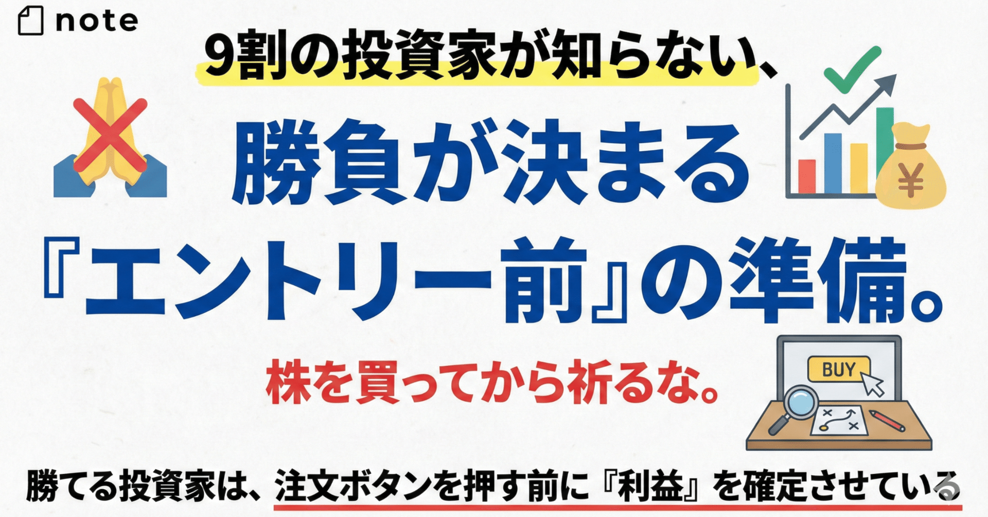 この本のタイトルにある「エントリー前の準備」とは、特別な裏技のことではない。むしろ逆だ。誰でもできるが、面倒で地味で、すぐに成果が見えにくいから、多くの人が飛ばしてしまう部分だ。だからこそ、ここに勝負が決まる差がある。注文ボタンを押してから必死に考えるのではなく、押す前に考え切る。押した後は、考えない。決めたことを実行する。これが「祈らない投資家」の基本姿勢になる。