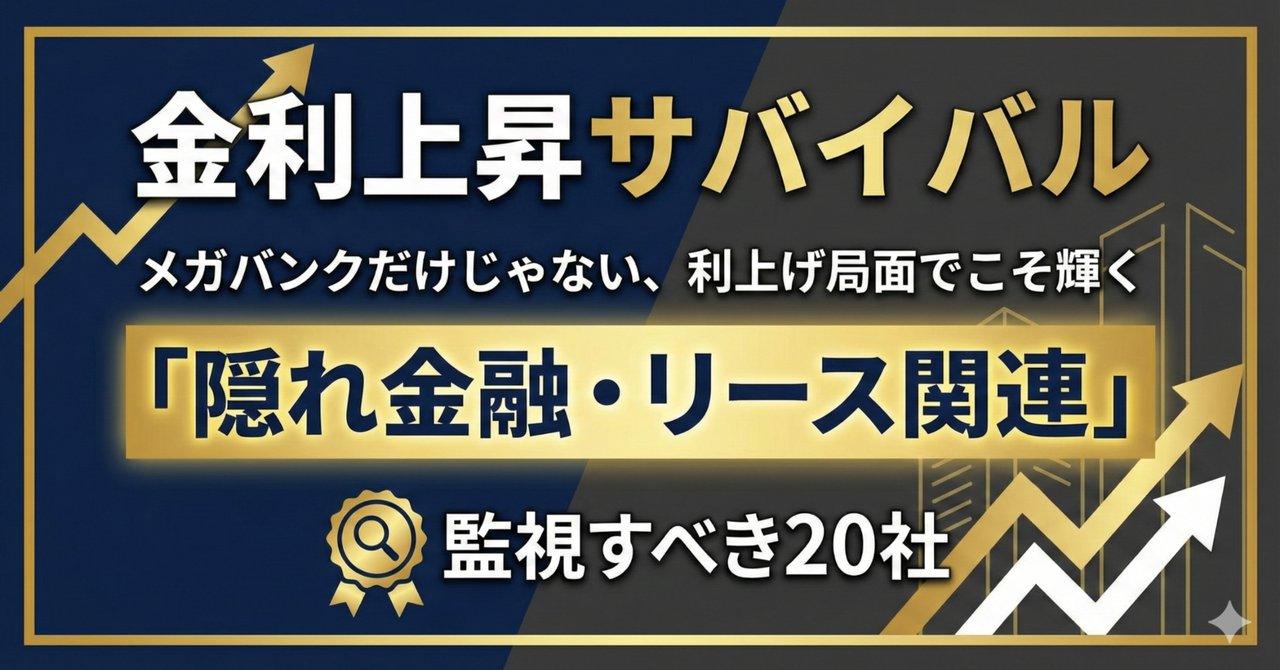 本記事では、東京証券取引所に上場する金融・リース関連銘柄の中から、市場での知名度は高くないものの、利上げ局面での業績改善ポテンシャルが高いと考えられる20社を厳選して紹介する。地方銀行、リース会社、オートクレジット、住宅ローン専業会社、ネット証券、損保グループ、ペット保険まで、セクターをまたいで「金利の恩恵が波及する企業群」の全体像を浮き彫りにしていく。