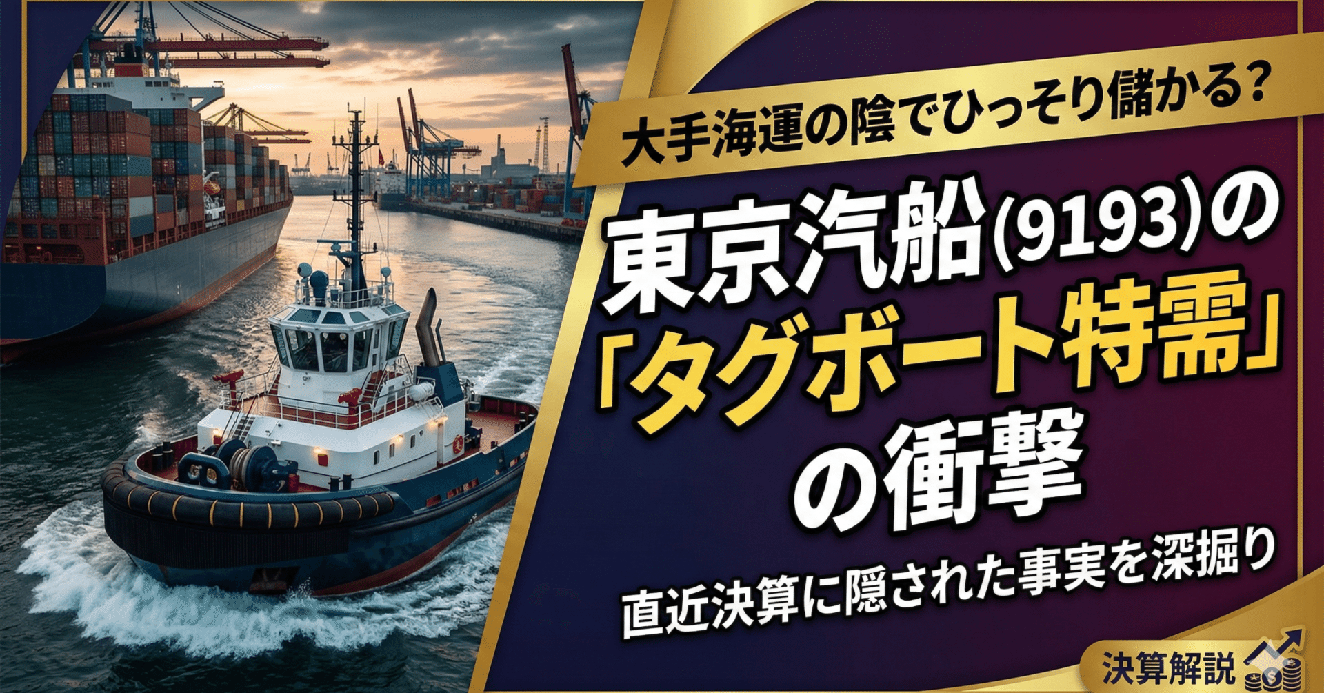 東京汽船は、東京湾全域でタグボート(曳船)を運航し、大型船舶の離着岸や進路警戒を担う「海の安全インフラ」企業である。武器は、日本最大規模のタグボート船隊と、東京湾という世界有数の海上交通過密海域における圧倒的なオペレーション経験、そして洋上風力発電向け交通船(CTV)のパイオニアとしてのポジションにある。最大のリスクは、東京湾への入出港船舶数が構造的に大幅増加しにくいという「天井感」と、エネルギーコスト上昇を料金転嫁しきれない収益構造の脆さである。