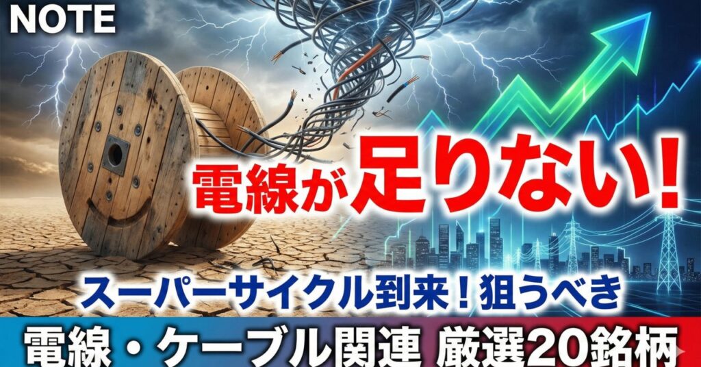 電線が足りない!スーパーサイクル到来で狙うべき「電線・ケーブル関連」厳選20銘柄 (5802/5803他)今、世界中で「静かなる産業革命」の裏側で、ある物質の争奪戦が始まっています。それは半導体でも、AIチップそのものでもありません。それらを動かすため... -