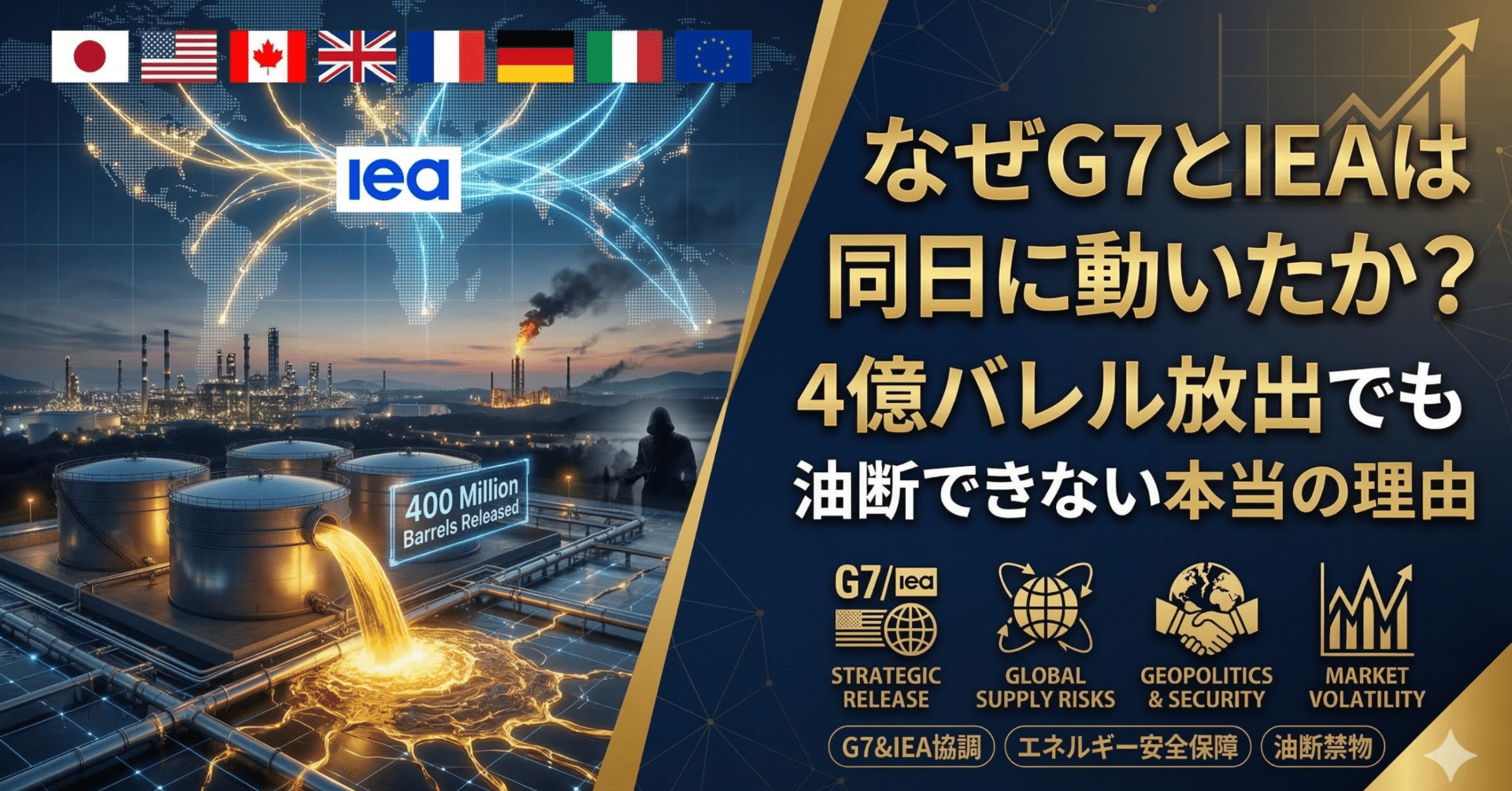 まず、一次情報である事実を確認します。 G7(主要7カ国)とIEA(国際エネルギー機関)が、同日に協調して4億バレルの石油備蓄放出を決定しました。