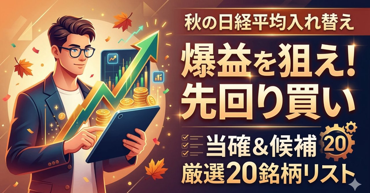 【免責事項】 本記事で提供する情報は、投資判断の参考となる情報の提供を目的としたものであり、特定の銘柄の売買を推奨または勧誘するものではありません。日経平均株価の銘柄入れ替えに関する予測は、過去のデータや独自の分析に基づくものであり、実際の採用を保証するものではありません。株式投資には、株価の変動、為替の変動、発行体の信用状況の悪化などにより、投資元本を割り込むリスク(元本欠損リスク)が伴います。投資に関する最終決定は、ご自身の目的、資金、リスク許容度等を総合的に勘案し、読者ご自身の責任と判断において行ってください。本記事の情報に基づいて被ったいかなる損害についても、作成者および提供元は一切の責任を負いません。