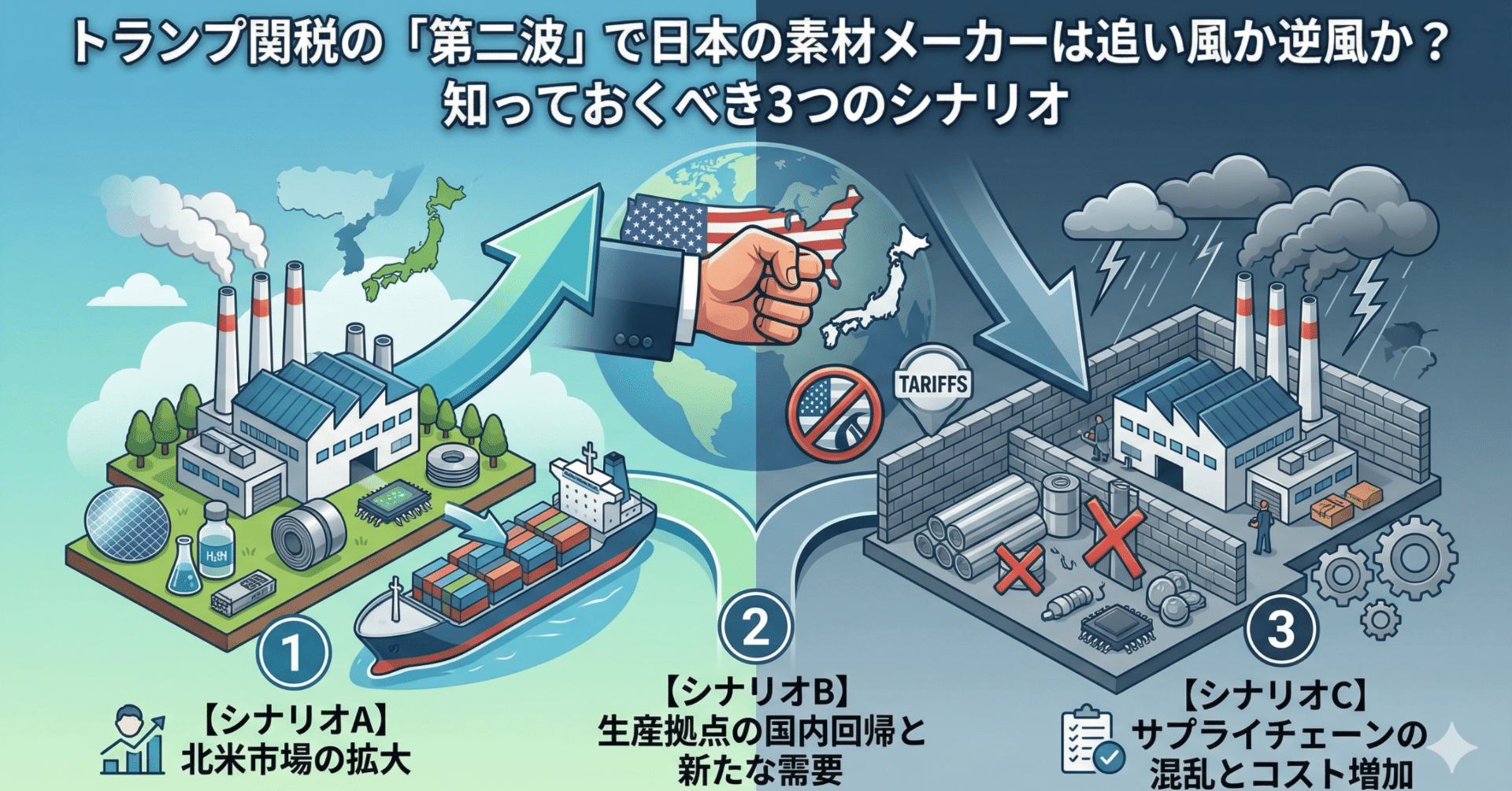 基本シナリオは「分断による特需と再編」です。 発生条件は、関税が予定通り発動されつつも、世界経済が緩やかな成長を維持している状態です。 この場合、日本の高品質な素材メーカーは代替需要を取り込み、業績を伸ばすと考えます。 やることとしては、関税の影響を受けにくい高付加価値製品を持つ企業の押し目を丁寧に拾っていくことです。 やらないことは、価格競争力だけで勝負している汎用品メーカーに手を出すことです。 チェックするものは、対象企業の海外売上高比率の変化と、アメリカ向けの輸出動向です。