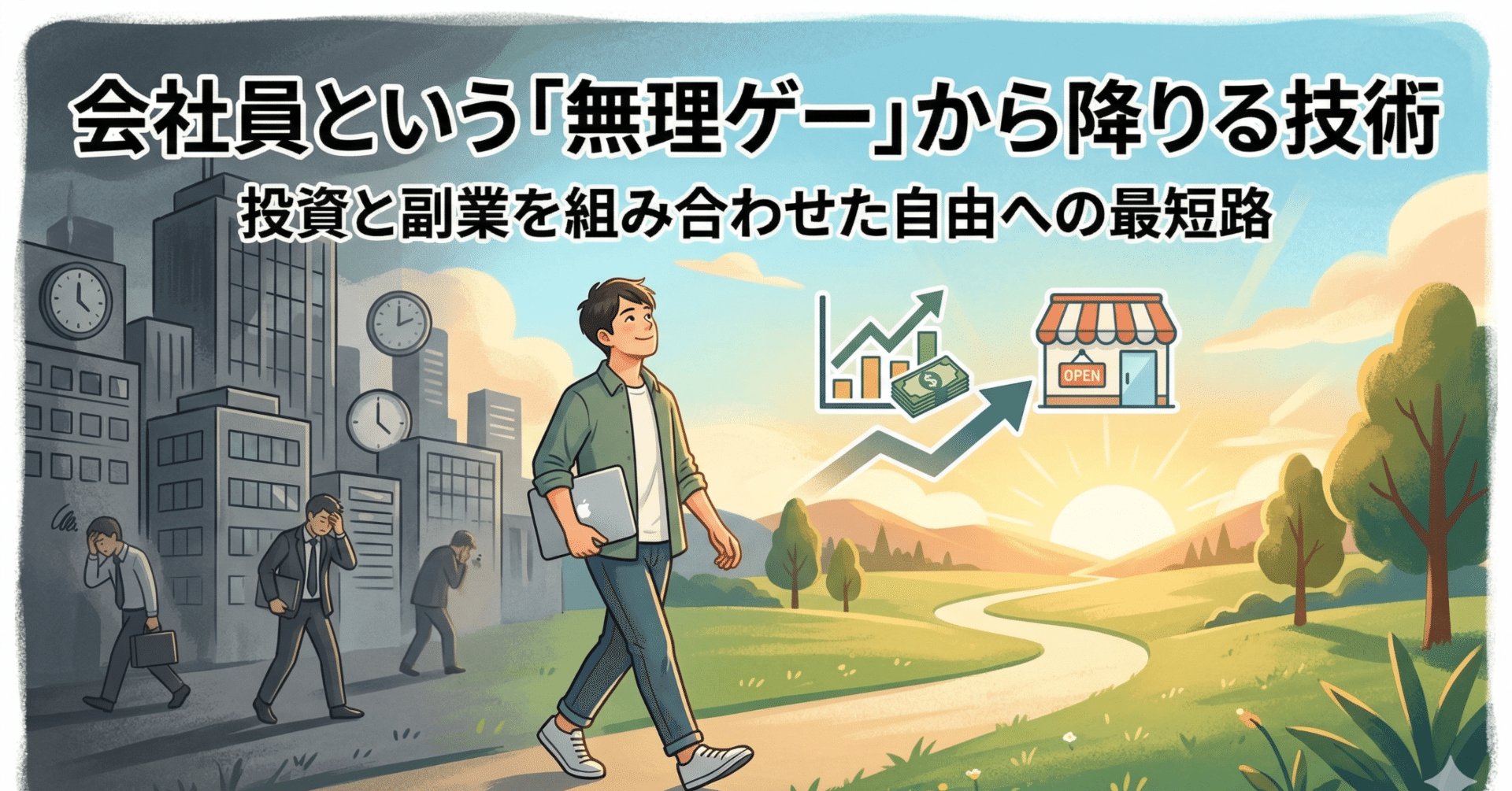 会社員という無理ゲーから降りる本当の目的は、ただ働かなくなることではありません。自分の人生を、自分にとって持続可能な形に作り替えることです。投資も副業も、そのための手段であって、苦しみの再生産であってはいけない。自由への道で最も避けるべき失敗は、会社を出ることではなく、会社の外に同じ構造を再現してしまうことです。そのことを忘れなければ、ここまで積み上げてきた戦略は、きっとあなたを本当の自由へ近づけてくれます。