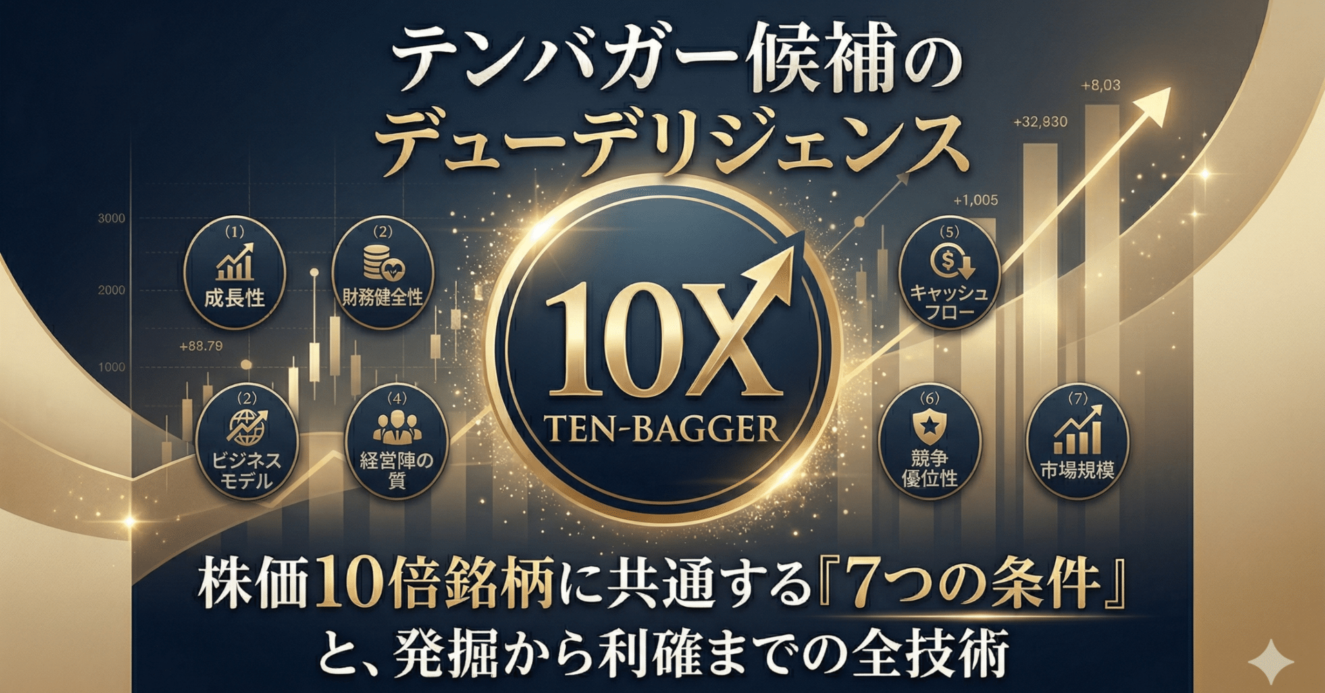 ここまでで、テンバガーとは何か、その出方にはどのような構造があるのか、そしてどのような誤解を排除すべきかを整理してきた。では実際に、何を基準にテンバガー候補を見抜けばよいのか。本書の中核になるのが、「7つの条件」という枠組みである。これは魔法の公式ではないし、すべて満たせば必ず十倍になるという保証でもない。だが、長期で大きく上昇する企業を観察すると、例外なくこの七つの観点のどこかに強さがある。そして、複数の条件が同時に揃ったとき、株価十倍の可能性は大きく高まる。