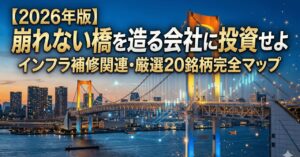 【投資に関する免責事項】 本記事で紹介する銘柄および投資情報は、2026年時点のデータや市場環境に基づく企業分析の提供を目的としたものであり、特定の株式の売買を推奨・勧誘するものではありません。株式投資には元本割れのリスクが伴います。各企業の業績悪化、原材料価格の高騰、建設業界特有の「2024年問題」による労務費の上昇、またはマクロ経済の変動により、株価の下落や減配・無配転落のリスクが存在します。投資を行う際は、必ずご自身で最新のIR情報や財務状況を確認し、リスク許容度に応じたご自身の判断と責任において行ってください。本記事の内容によって生じた損害について、一切の責任を負いかねます。