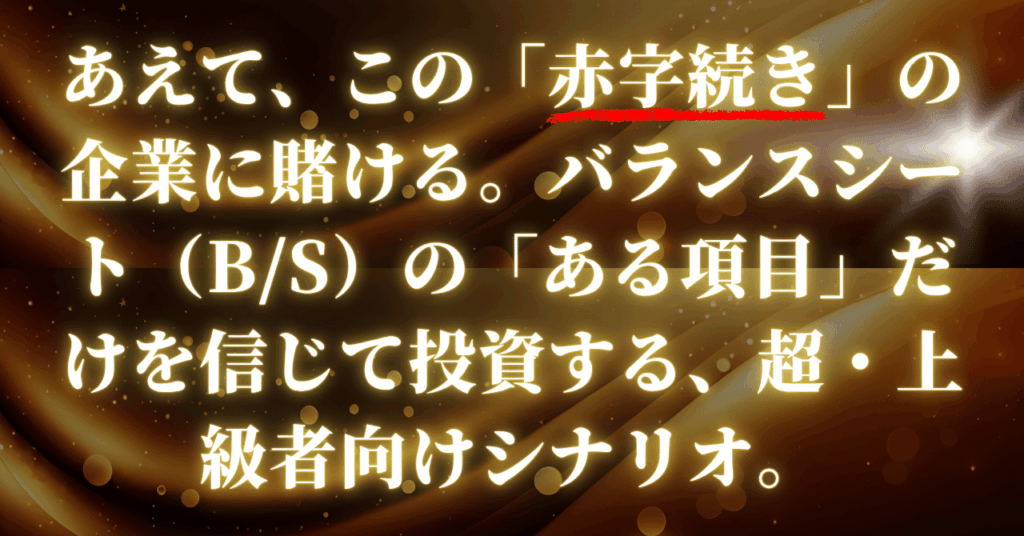 あえて、この「赤字続き」の企業に賭ける。バランスシート(B/S)の「ある項目」だけを信じて投資する、超・上級者向けシナリオ。
