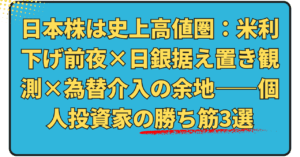 日本株は史上高値圏:米利下げ前夜×日銀据え置き観測×為替介入の余地——個人投資家の勝ち筋3選