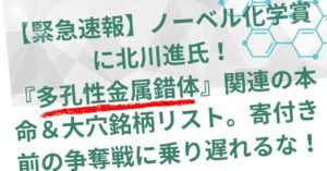 【緊急速報】ノーベル化学賞に北川進氏!『多孔性金属錯体』関連の本命&大穴銘柄リスト。寄付き前の争奪戦に乗り遅れるな!