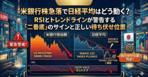 米銀行株急落で日経平均はどう動く?RSIとトレンドラインが警告する「二番底」のサインと正しい待ち伏せ位置
